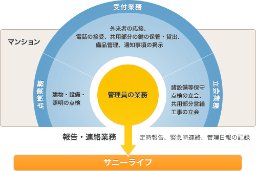 都心から離れた立地にあるリゾートマンションでは、フロントマンが現場を把握しない事によるトラブルが起こりがちです。サニーライフでは、リゾートマンションの規模に応じて住込の管理員や地元から通勤する管理員を派遣し、本社のフロントマンもフットワークよく巡回し、現場まかせにはいたしません。